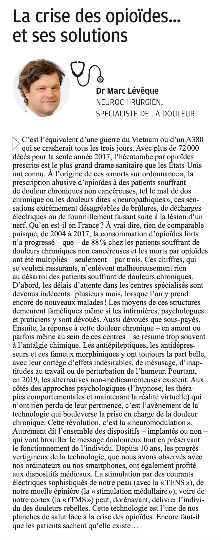 Le Dr Marc Lévêque est neurochirurgien et spécialiste de la douleur. Il prend en charge, le plus souvent par microchirurgie (c'est à dire sous microscope opératoire), les maladies de la colonne vertébrale ( hernie discale lombaire et cervicale, canal lombaire étroit, canal cervical étroit...) sachant que, fréquemment, ces pathologies peuvent être efficacement soulagées par un traitement médical.