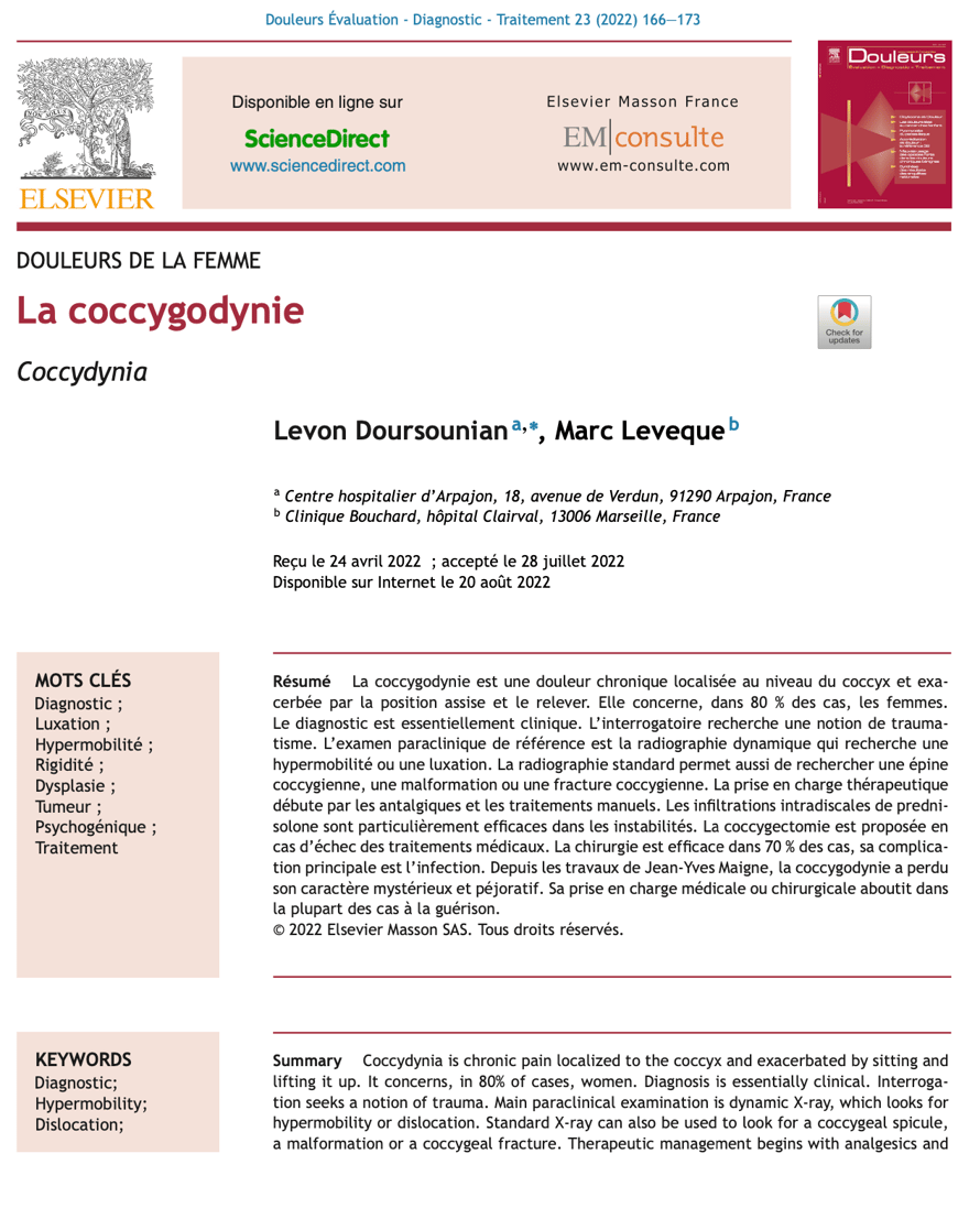 Dans cette partie du site consacrée à la coccygodynie vous trouverez des informations sur l'anatomie, l'examen clinique, l'imagerie, les traitements disponibles ainsi que des références bibliographiques.