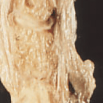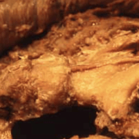 Une découverte intéressante de nos dissections était que dans certains cas, l'articulation était une structure intermédiaire entre disque et articulation synoviale. Plus précisément, il y avait une fente intra-discale bordée de cellules synoviales, bien visible sur cet échantillon. Une question vient immédiatement à l'esprit : le type d'articulation (discale, intermédiaire ou synoviale) est il déterminé à vie chez un individu donné, ou bien y a t'il un changement continu et progressif du disque chez le plus jeune à une articulation synoviale chez le plus âgé, via l'apparition d'une fente qui vient séparer le disque ? Un tel phénomène existe au niveau du disque cervical.
