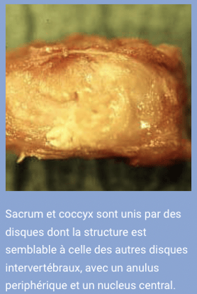 Il y a peu d'information sur l’anatomie du coccyx dans la littérature. Selon Gray, les articulations sacro-coccygiennes sont de petits disques inter-vertébraux très minces, constitués de fibrocartilage et les articulations inter-coccygiennes peuvent être soit des articulations synoviales, soit des disques.2 En examinant neuf coccyx de sujets âgés provenant de cadavres frais, nous avons trouvé que l'articulation sacro-coccygienne était discale dans un cas, synoviale dans quatre cas et intermédiaire dans les quatre derniers cas, l'articulation étant constituée d'un disque parcouru d'une fente plus ou moins importante, parallèle aux plateaux et bordée soit de fibres annulaires soit de cellules synoviales.3 Cet état intermédiaire ne fut pas trouvé dans les articulations inter-coccygiennes. On ne sait pas si la même distribution aurait été trouvée chez des individus plus jeunes, ce qui revient à poser la question de savoir si cette fente progresse au cours de la vie sous l’effet des contraintes mécaniques, le disque évoluant progressivement vers une articulation synoviale chez une même personne. Les articulations synoviales autorisent plus de mobilité que les disques. Un quatrième type existe sous forme d'une ossification complète de l’articulation sacro-coccygienne. En étudiant deux populations différentes, la fréquence des ossifications était respectivement de 22 et 68 % des cas.4 Chez quelques-uns de nos patients, c'est le coccyx complet qui est ossifié.