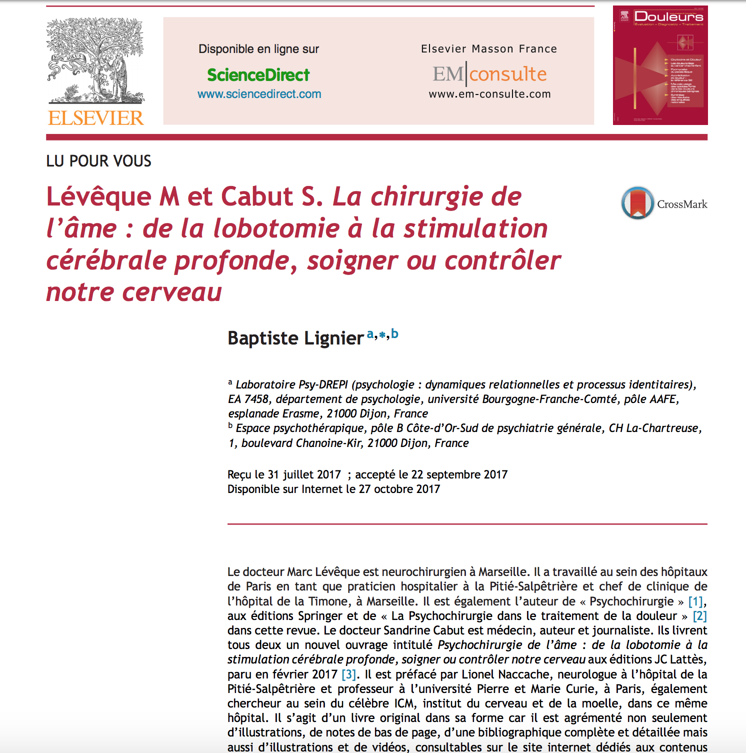 Analyse de l'ouvrage dans la revue Neurochirurgie par le neurochirurgien Pr Marc Guénot et dans la revue PSN (Psychiatrie, sciences humaines, neurosciences) par l'anthropologue Baptiste Moutaud.