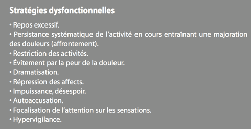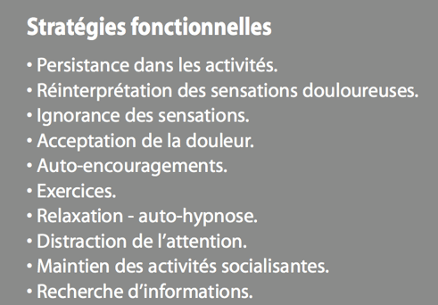 Le coping représente l’ensemble des processus cognitifs et comporte- mentaux spécifiques utilisés par le sujet pour gérer sa douleur et les diverses réactions émotionnelles qu’elle peut induire. Les recherches étudiant le lien entre douleur et stratégies d’adaptation ont montré que certaines stratégies permettent au patient de mieux faire face à leur douleur. On parle de stratégies « adaptatives ou fonctionnelles ». D’autres ont été désignées comme particulièrement délétères (« stratégies mal adaptatives ou dysfonctionnelles ») .