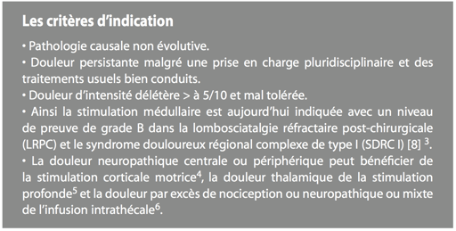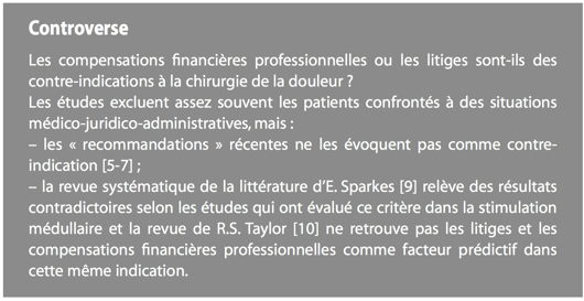 Les critères d’indications et contre-indications de la chirurgie de la douleur (neuromodulation) se sont précisés depuis 1998 [4]. Certes, ils excluent des patients présentant des contre-indications absolues à la chirurgie de la douleur mais ne sont pas assez discriminants sur les contre-indications relatives.