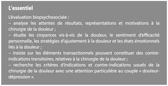 L’évaluation psychologique préchirurgicale identifie les réactions émotionnelles, les pensées et les comportements « maladaptatifs » qui contribuent à la douleur et à l’incapacité fonctionnelle. Ces facteurs transactionnels présents avant la chirurgie peuvent être toujours actifs après et venir impacter l’efficacité de cette dernière.