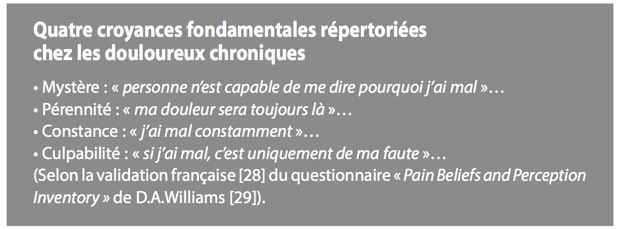 Les croyances associées à la douleur jouent un rôle majeur dans la perception douloureuse. De nombreuses études ont montré qu’elles pouvaient influencer le vécu douloureux, l’ajustement à la douleur et la réponse aux traitements. Par exemple, les croyances sur la durée, la gravité des douleurs et du handicap impactent grandement l’ajustement émotionnel et physique des patients .