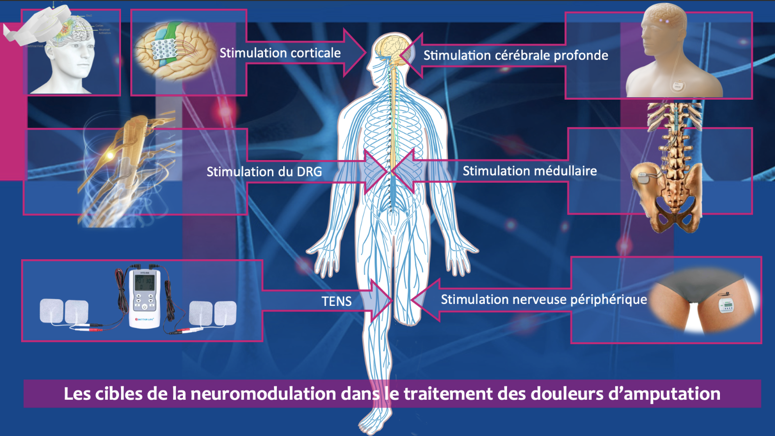 Les douleurs constituent malheureusement une complication fréquente de l'amputation que ce soit les douleurs de moignon où les douleurs de membre fantôme. Les médication chimique ne sont pas toujours efficaces et quand ils le sont cela peut être au prix d'effets indésirables. Dans ce contexte, les thérapies de neuromodulation peuvent offrir des solutions à ne pas négliger.